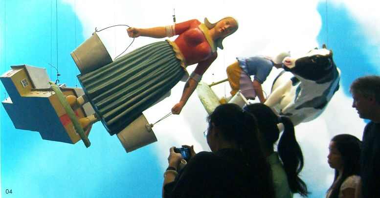 现在汉克递过来一个新的对象,它是一个画着荷兰风景的画盘。不过这已经足够了,沿着这个线索,隋建国把我们带进“荷兰-北京”这个巨大的空间意念中。他的方法是把这十个物体以同样的倾斜角度悬挂在空中——这个角度(即物体被倾斜后原正常重心线与垂线之间的夹角),在以地心为坐标0点的地球极坐标系中,约等于荷兰与北京的夹角。换个表述方式:也就是说,这样十个物体是从荷兰的垂直状态“平移”到北京来的!悬挂在空中的景观加强了这种空间大挪移的意象,从而揭示和表达了一个超出人们日常意识的巨大空间。通过对这个空间的激活,作品变得异常辽阔并包容和隐喻了丰富的文化印象、想象和意象。而作者却保持着一种半退隐的状态——他只是借用一种平移或类镜像的方式传达了自己的空间意识。
