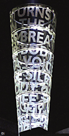 从以上的作品中我们可以看出Plensa的正式的词汇显然经历了从抽象到具象的转换,这种变化本身就具有某种意义。艺术是社会相互作用,相互理解的催化剂,艺术的长期实践本身就具有深刻的哲学含义。或许,大尺度的作品是在公共艺术中所需要的,而就比例而言,我并不认为它只意味着物质本身,它是一种思想能及的范围。他拒绝强加于公众一种模式化的符号,这点我们可以从他的早期追寻一些足迹,他的前提是重新思考同机遇、物质、新的群体之间的关系,适当的时候加入新的文化。他最近的作品是为伦敦BBC传媒中心制作的作品《呼吸》Breathing(2005),这同样是一件灯光装置作品,却与以往的作品有很大的不同。作品意图明显,不仅仅寓意着BBC为国家民族而发声,还是为了接收那远在天际的声音。巨大的玻璃锥体由屋顶伸向穹隆,锥体内嵌文字,当观者以不同的角度,不同的透视观看,会有不同的文字、语句。就这样,断裂的文字凝固了那些看不见的发散的光和气,将那些混乱的单词彼此渗透,就像是英语中声音的凝固和断裂,掷地有声,落入人们的心里。