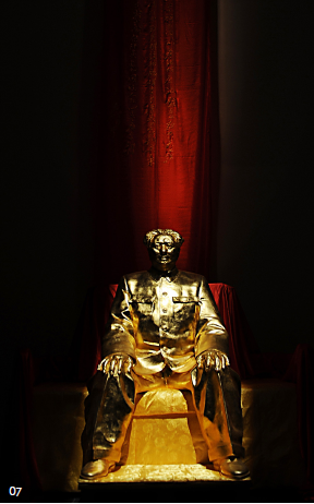 田世信在这组群雕之中,以毛泽东词为主题立意的依据,用观念性的当代艺术表达方式,塑造了中国历史中最具王者之尊、最为深远地影响了中国历史走向和精神文化的五位“王者”,即毛泽东词中所提的秦始皇、汉武帝、唐太宗、宋太祖、元太祖,加上词主毛泽东共六位。